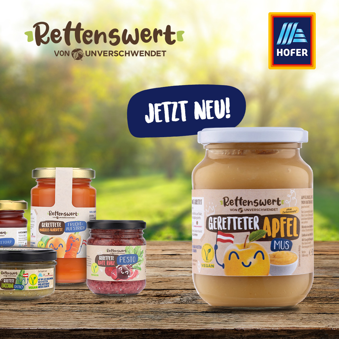 Ab heute sind die Regale wieder voll mit Rettenswert Produkten in allen HOFER Filialen österreichweit. Zusätzlich zu Fruchtaufstrich, Pesto und Co. wird es auch ein Apfelmus geben, welches aus geretteten, österreichischen Äpfeln produziert wurde!