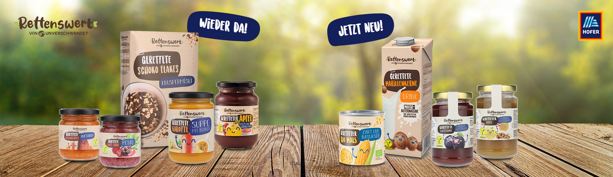 Der RETTENSWERT Bio Mais in der Dose ist unser erstes Produkt, das wir bereits abgepackt retten konnten und wird in deinem Salat zum farbigen Highlight im Winter. Wieder mit dabei in allen HOFER Filialen sind die beliebten Pestos in den Sorten Karotte, Rote Rübe und Kürbis. Keine Koch-Idee und wenig Zeit? Die RETTENSWERT Gemüsesuppen in den zwei Varianten Karotte Ingwer und Süßkartoffel sind schnell zubereitet, köstlich und aus gerettetem Gemüse. Ebenfalls schnell geöffnet und verputzt sind die Aufstriche Süßkartoffel und Karotte Curry.