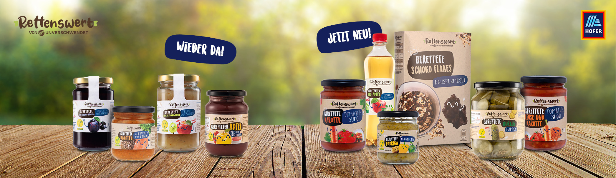 Am 25. August 2023 füllen sich die HOFER Regale wieder mit feinen Produkten von RETTENSWERT aus sorgfältig ausgewählten geretteten Zutaten. Sommerliche Temperaturen wecken die Lust auf leichte, mediterrane Speisen. Mit der RETTENSWERT Bruschetta Paprika und Paprika & Tomate wird dieser Wunsch erfüllt. HOFER Kund:innen erwartet der italienische Klassiker mit geretteten Zutaten. Gerettete Karotten sind die wertvolle und geschmacksgebende Basis für die drei Sugo-Varianten, Kräuter, Linse und pikante Arrabiata. Mit der Lieblingspasta, ein perfektes, schnell zubereitetes Essen. Im August auch wieder im RETTENSWERT Regal mit dabei: Zwei Varianten des beliebten Apfelmus Apfel Birne und Apfel Erdbeere. Außerdem wird es wieder das bereits bekannte RETTENSWERT Weichsel Gelee und die feinen Fruchtaufstrich-Duos Zwetschke-Aronia und Apfel-Stachelbeere. Fans von pikanten Aufstrichen können sich wieder auf den RETTENSWERT Süßkartoffel Aufstrich und den RETTENSWERT Karotte Linse Aufstrich freuen.